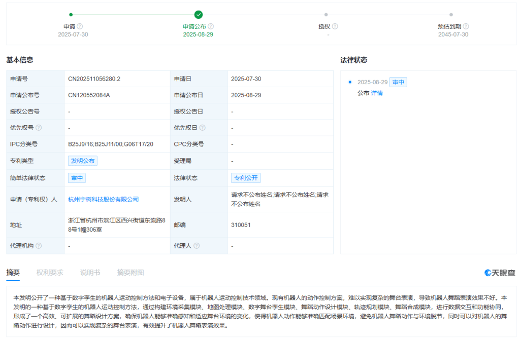 Unitree has applied for a patent on a digital-twin-based motion control method that lets robots adapt to stage environments and perform complex choreography. By combining sensing, mapping, dance design, and trajectory planning, it greatly enhances robotic dance performances.
